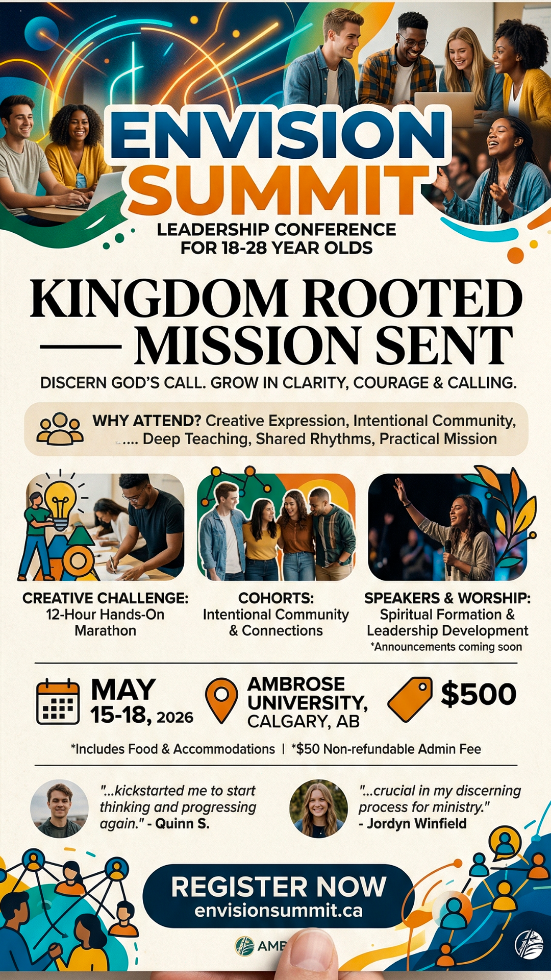 It’s a leadership conference happening from May 15–18 at Ambrose University in Calgary for young adults (ages 18-28).